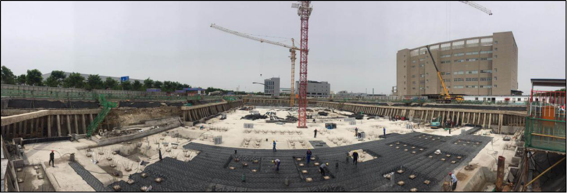 项目位于天津市天津市西青区芦北路南侧,赛达北四道北侧。基坑深度为12.1m、13.6m,基坑开挖面积为8.3万㎡,初始方案为灌注桩+钢筋混凝土水平支撑,采用倾斜支护桩方案,取消了大面积的水平支撑,节省造价30%以上。