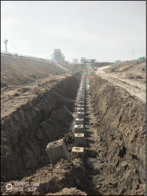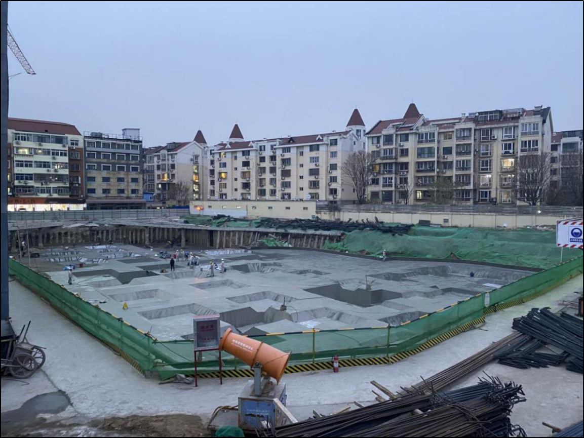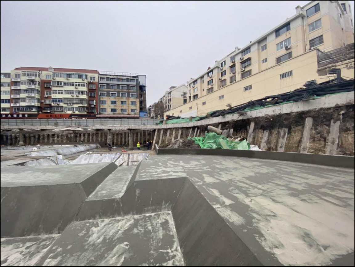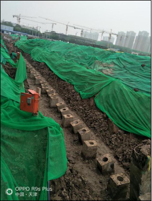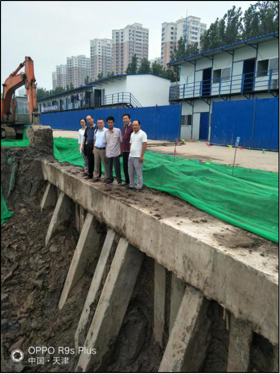 项目位于天津市滨海新区,基坑开挖深度为5.8m,基坑开挖面积为9400㎡,初始方案为灌注桩+钢筋混凝土水平支撑,采用倾斜支护桩方案,节省水平支撑所产生的造价370余万工期缩短,绿色环保。