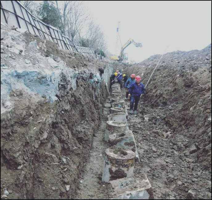 项目位于天津市津南区,基坑开挖深度为4.9m,基坑开挖面积为4.6万㎡,初始支护方案为预制桩+钢筋混凝土水平支撑,采用倾斜桩支护方案后,取消了大面积的水平支撑,工期提前1个月以上,并节省了由施工水平支撑所产生的费用。与此同时,基坑中设置了悬臂竖直支护对比试验段,相比之下,单排桩悬臂支护的桩顶最大水平位移超过100mm;而斜-直交替支护形式的桩顶水平位移小于40mm。